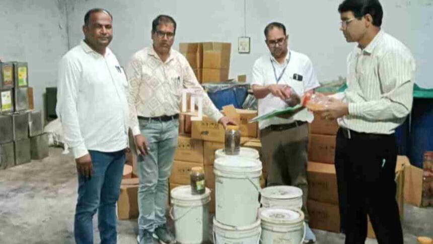 पलसाना में खाद्य सुरक्षा अधिकारियों की टीम ने छापेमारी के दौरान मैसर्स के गोदाम में बदबूदार और फंगस युक्त मुरब्बा पाया। इसमें 432 किलो आंवला मुरब्बा, 170 किलो गाजर मुरब्बा, 80 किलो बांस मुरब्बा और 70 किलो बिल मुरब्बा शामिल थे। इन सभी को तत्काल नष्ट कर दिया गया। यह कार्रवाई खाद्य सुरक्षा एवं औषधि नियंत्रण आयुक्त डॉ. टी शुभमंगला और मुख्य चिकित्सा एवं स्वास्थ्य अधिकारी डॉ. अशोक महरिया के निर्देशन में की गई। टीम में फूल सिंह बाजिया, महमूद अली, नंदराम मीणा और सुरेश कुमार शर्मा शामिल थे।